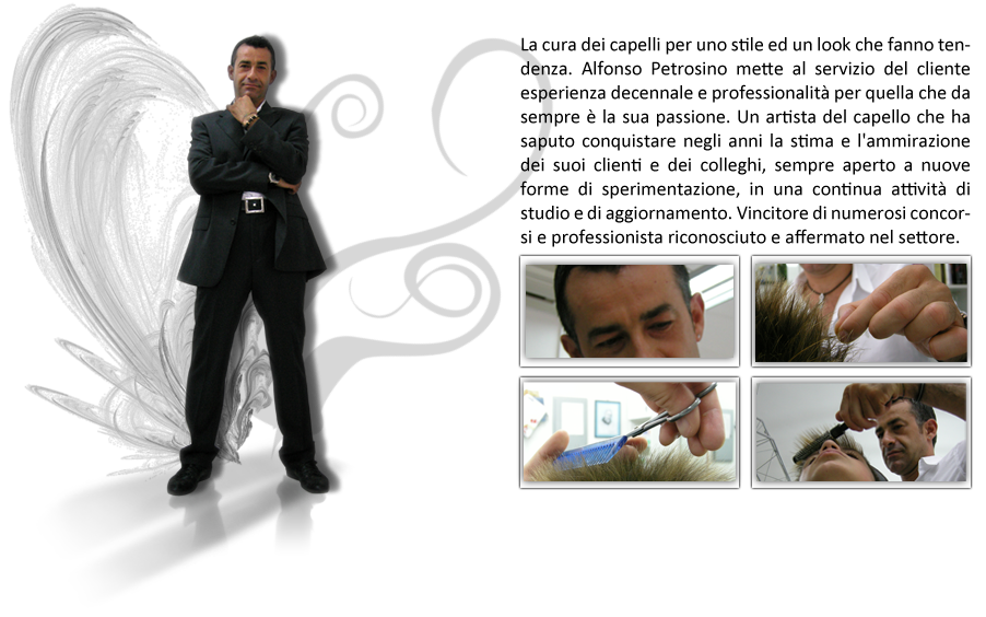 La cura dei capelli per uno stile ed un look che fanno tendenza. Alfonso Petrosino mette al servizio del cliente esperienza decennale e professionalità per quella che da sempre è la sua passione. Un artista del capello che ha saputo conquistare negli anni la stima e l'ammirazione dei suoi clienti e dei colleghi, sempre aperto a nuove forme di sperimentazione, in una continua attività di studio e di aggiornamento. Vincitore di numerosi concorsi e professionista riconosciuto e affermato nel settore.